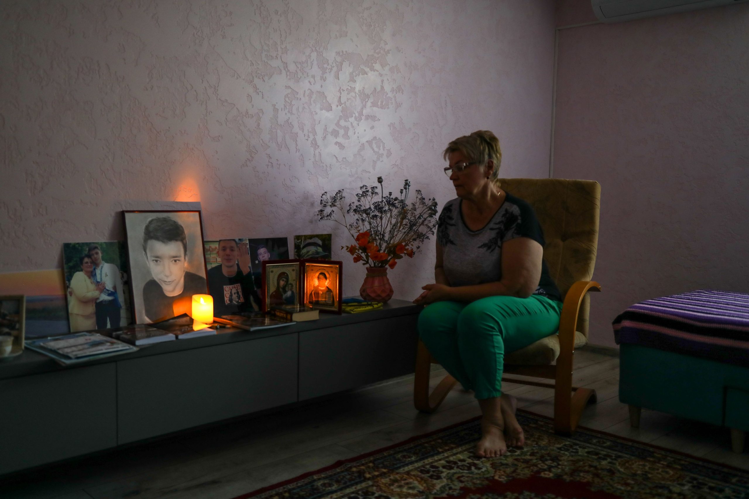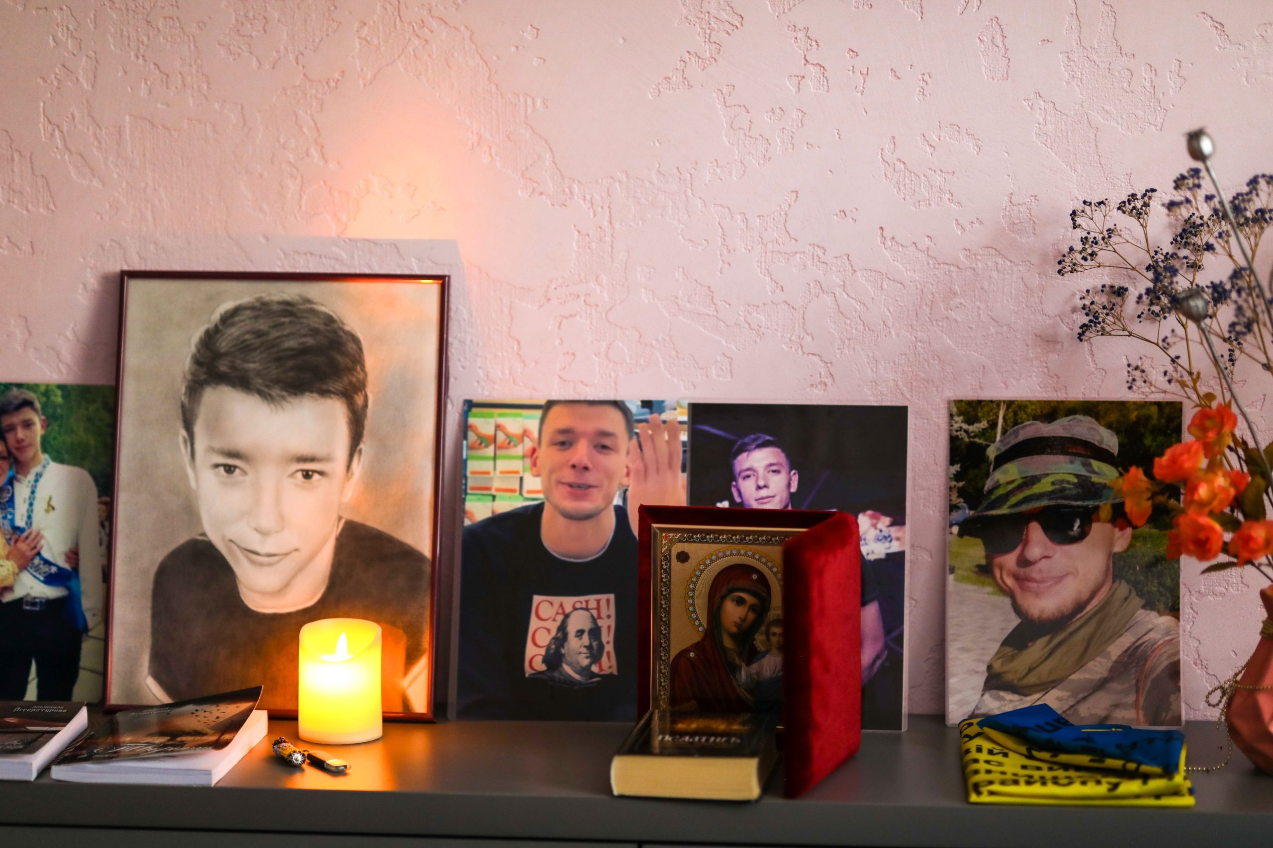 After returning home from the cemetery, she enters his room, which she has turned into a sanctuary. She takes refuge here, among photographs, icons, candles, books, diplomas, QR codes, and drawings of Ukrainian girls, to sit quietly and talk to him. „Tell me, Igor, how is it there with you? I know you’ll get along everywhere.