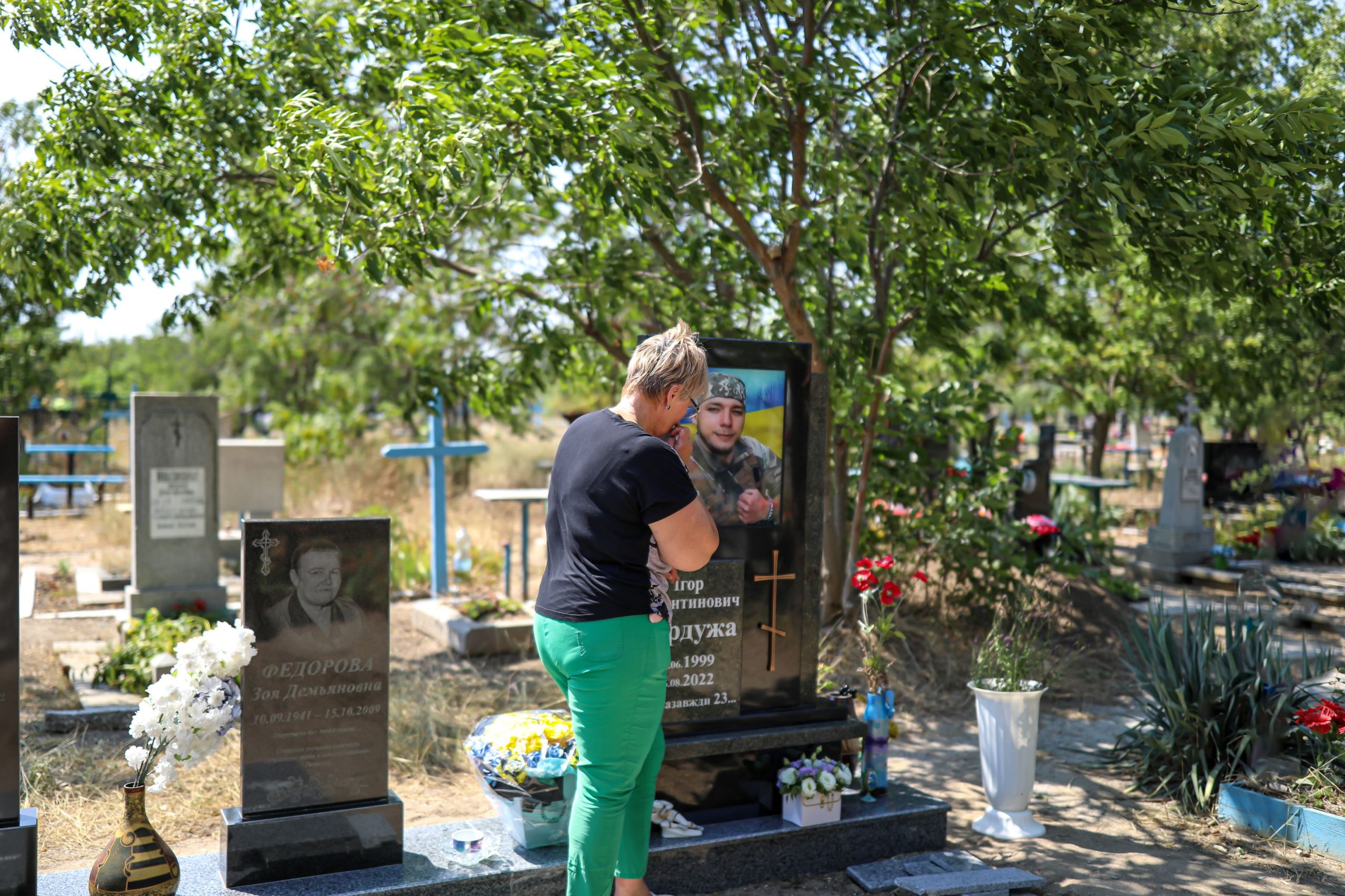 Svetlana is breathing heavily. She takes a deep breath as if trying to fill a void. „Damn the war!” she says mournfully, as the Ukrainian flag flutters amid the silent crosses of the cemetery, swaying in the wind and bearing the names of those who will never return.
